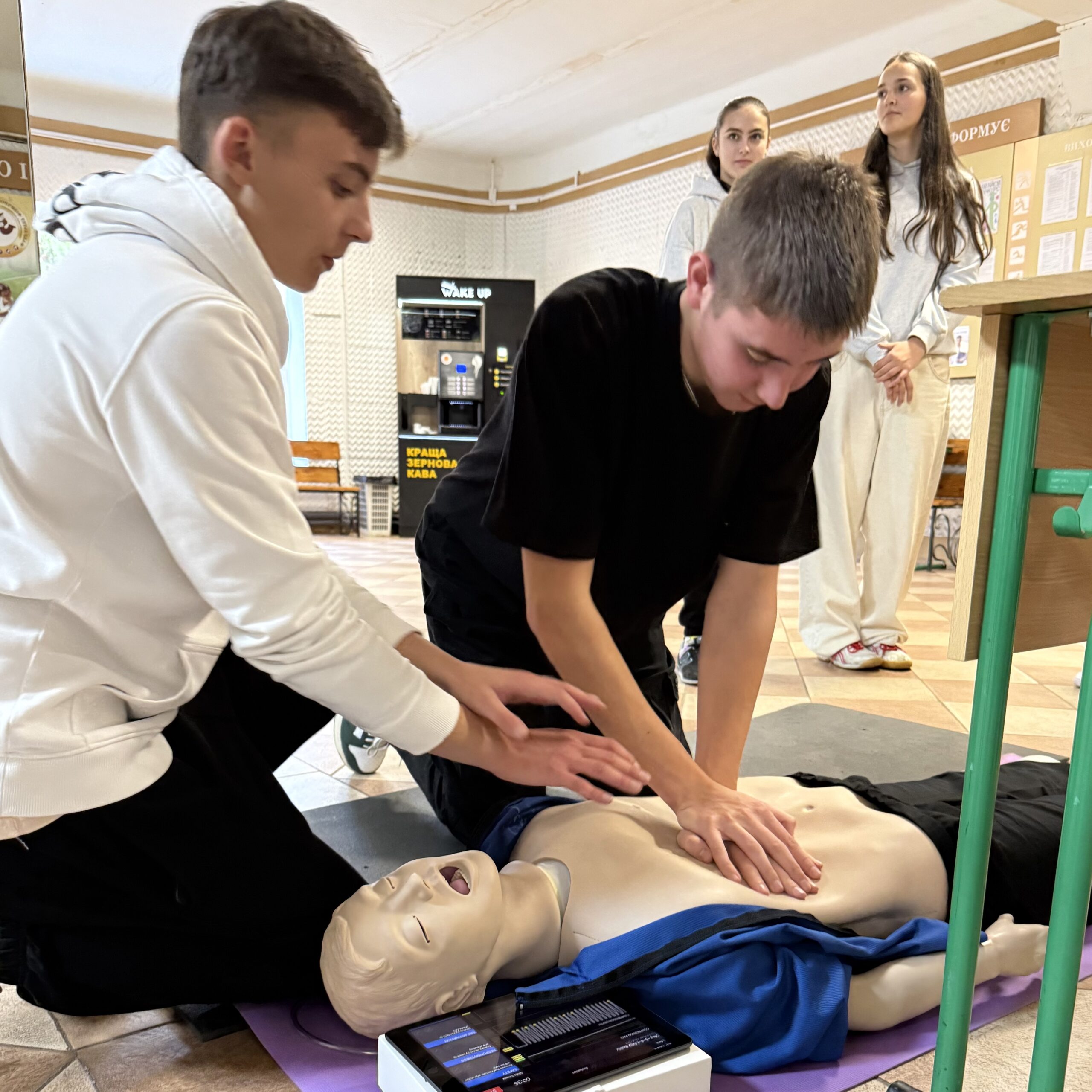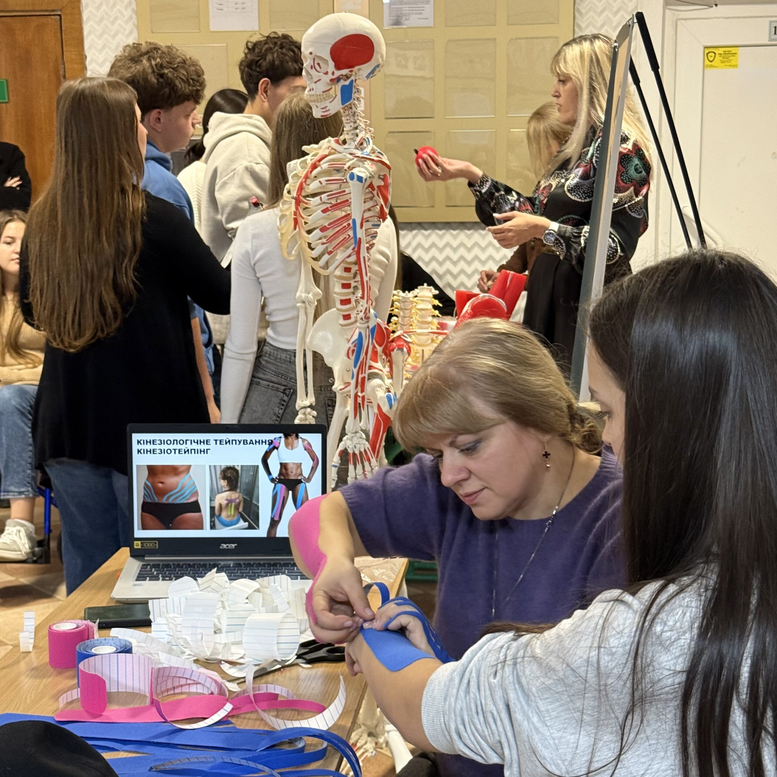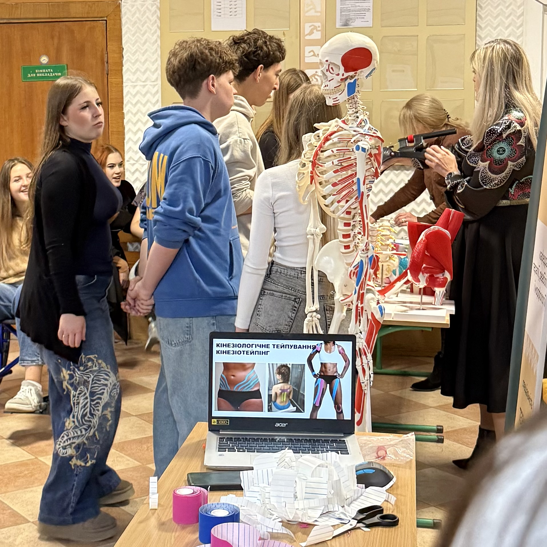 Впродовж заходу близько 100 школярів відвідали наші локації та мали змогу ознайомитися з практичними аспектами професії реабілітолога – від надання першої допомоги та проведення реанімаційних дій до кінезіологічного тейпування і роботи з анатомічними моделями. Вони вчилися бачити, як теоретичні знання перетворюються на реальні інструменти відновлення здоров’я. Також відвідувачі випробовували засоби ерготерапії та крісла колісні, щоб зрозуміти важливість доступного середовища й підтримки людей з порушеннями руху.
